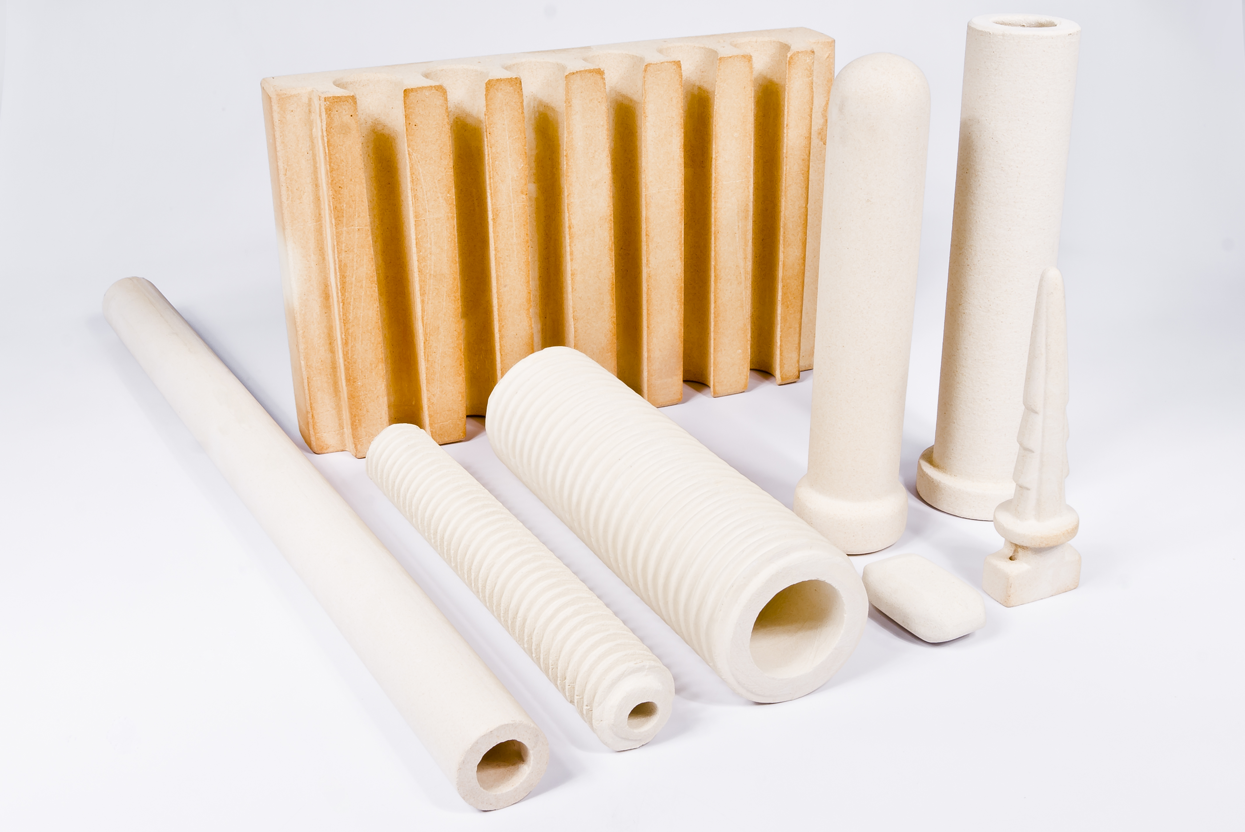 As peças refratárias são desenvolvidas conforme desenho técnico – atende pequenas e grandes quantidades. Fabricadas a partir de três tipos de formulações – cada formulação é indicada um tipo de aplicação de temperatura, tensão, pressão e torção que a peça é submetida. As peças são queimadas a 1290º graus, e a formulação básica é composta por – argila, quartzo, feldspato, caulim, alumina, cianita, petanita e talco. Processo de fabricação – barbotina (colagem) e torneação após prensagem a vácuo.